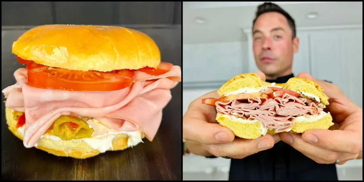 - Spread cream cheese on both sides of the toasted bagel. Add giardiniera to one side of the bagel, then Black Powder Rub to the other side, and top with tomato slices and then a few more sprinkles of Black Powder Rub on top of tomato. Add the mortadella on top of the giardiniera, folding one slice at a time and placing it so it’s nice and high.